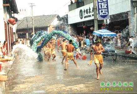 張家界潑水龍又叫“澆水龍”,于唐朝時期由移居本地的白族興起演變而成,在永定區(qū)的尹家溪鎮(zhèn)西尹村、莫家崗村十分盛行,是當(dāng)?shù)?a class="insidelink" href="http://m.flhxd.com/fengqing/" title="土家族">土家族,白族、苗族在天熱干旱時節(jié)求雨祈福的一種形式。一旦出現(xiàn)旱災(zāi),當(dāng)?shù)仡^面人物就會出來組織潑水龍,演出極其隆重。
