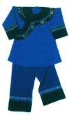 據(jù)史載,有關(guān)土家族的服飾宋代稱“溪布”、“峒布”、“土錦”等。后受漢族先進技術(shù)影響,土家人用自織自染的“土布”做成圍裙。到現(xiàn)代,土家服飾發(fā)生了巨大變化,但仍保留了許多傳統(tǒng)樣式。土家族人始終著以琵琶襟為特征的滿襟衣。托肩矮領(lǐng)大袖口,滾花邊。男捆腰帶,女套繡花圍裙。頭上均包青布帕或絲帕,男帕左方垂一節(jié)過耳,婦女全包頭。未婚閨女留長發(fā)扎辮,用紅頭繩扎上下兩端,額前前留“劉海”。已婚婦女挽上發(fā)管,別簪,插銀首飾。褲子多為青、藍色、上結(jié)白布褲腰,褲腳短且大。青壯年男子打綁腿,女褲以對襯色布加邊,上綴三條均等的梅花條,腳上穿青布瓦鞋,包白色裹腳布。若遇喜慶節(jié)日或走親訪友,則另有一番梳妝打扮,如加佩牙簽、銀牌等。