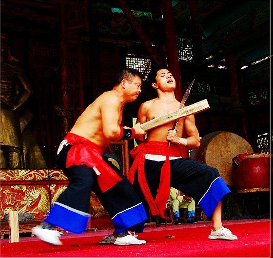 大庸氣,堪稱武林奇葩,曾為祖國贏得聲譽,海內(nèi)外享有極主名望。 大庸氣功是大庸各民族特別是土家族傳統(tǒng)體育項 目之了,分健體氣派、武術氣功兩類。前者有“返還 功”、“馬王推氣功”、“少林達摩醫(yī)療保健氣功” 等;后者有靜坐、壁虎、靈子、二指彈、碎石、松靜 、硬氣、五禽、五陽功等,尤以硬氣功著稱。大庸硬 氣功,歷史悠久,漢代相單程,明代覃后,清代劉明 燈,當代湯子模、周鐵鞭、杜心武、趙繼書等都具有 超人硬氣武功。大庸土著民族在漫長的反征服、反壓 迫斗爭,博采武當、少林南北派、昆侖派眾家武林精 華,創(chuàng)造出獨此一家的大庸硬氣功。 據(jù)傳,大庸硬氣功鼻祖是楚國鬼谷子?!队蓝h 志》有關鬼谷子隱居天門山鬼谷洞潛心學《易》、傳 授方術的記載。到清代有武林高手朱茂嶺,隱居三岔 村北芭蕉灣洞,研究鬼谷氣功之術,后收西溪坪胡口 子、余世萬(即“余通人”)為徙,傳其衣缽。余通 人將武術氣功系統(tǒng)整理,發(fā)揚光大,播名于世。 新中國成立后,黨和政府十分重視民間氣功發(fā)掘 整理,并正式列為體育項目加以普及發(fā)展,今日大庸 市習練硬氣功達數(shù)萬人眾。永定區(qū)官黎坪村世有“硬 氣功之鄉(xiāng)”盛譽,該村男女老幼,練功已蔚成風氣, 其武師趙繼書,1979年先后參加全省和全國武術大賽 ,均獲一等獎,受到國家體委重視,同年7 月趙繼書 專程到北京給中央領導同志匯報表演。嗣后,隨同中 國武術代表團和國家領導人先后兩次出國,到盧森堡 、意大利、比利時、羅馬尼亞、馬其他和東南亞等國 家訪問。他表演的臥刀碎石、頭頂開石、雙鳳灌耳、 頭碰石柱、叉尖推磨等精彩節(jié)目,博得外國友人好評 。盧森堡一位榮獲國家獎牌的武士,看了表演后連夜 來到中國大使館,將自己珍藏多年的獎牌贈送給他; 盧森堡國王主動熱情走上臺與趙繼書熱情擁抱,連連 稱贊:“了不起!了不起!國際氣功大師!”并把珍 藏紀念章一枚贈送給趙繼書。一位法國朋友十分贊賞 說:“中國的氣功,稱為全人類的寶貴財富,是有科 學道理的。”自此,大庸硬氣功譽滿全球。湖南瀟湘 電影制片廠專門拍攝了彩色紀錄片《大庸氣功》。 大庸硬氣功共有二十多個項目,最有影響的是: 腹臥鋼叉 由二人在地面扶住一根叉尖朝上的三 股鋼叉,叉尖猁鋒利,然后一個俯身叉尖,尖抵腹部 ,待其四肢平展懸空,扶叉二人轉動鋼叉,謂之推磨 。表演時,要求臥叉者運氣于腹,氣意集中,稍有大 意,叉即穿腹而過。 臥刀破石 先固定兩把大刀,刀口朝上,臥刀者 運氣后,由其他人抬臥于刀口上(有仰臥、俯臥兩種) ,然后在臥刀者腹部或背部置一碩大石條(約數(shù)百斤) ,一人或兩人輪大鐵錘狠擊石條直至斷裂破碎為止。 釘?shù)洞财剖?地上倒一層碎玻璃片,一人仰臥其 上;然后腹上置釘床,又一人仰臥釘床上,再于第二 人腹上置釘床,第三人仰臥刀床上,腹部上壓一塊數(shù) 百斤大條石,由人掄錘狠砸,至石破為止。 銀槍刺喉 用一根兩頭安有鋒利槍頭的鋼槍,抵 置兩位表演者喉部,然后相對發(fā)力,至槍桿抵成彎弓 形而喉部安然無恙。 徙手斷石 表演者將堅滑如鐵一塊卵石置于石凳 (地)上,然后運氣于掌或指擊斷(碎)卵石。 踢腿斬石 表演者運氣于腿,以腿踢斷石條。一 般可踢斷15公分以上厚度的麻石條或青石條。 胸部打刀 將鋒利大刀刃口置于胸部肌肉上,用 一根拳頭粗木棒猛擊刀背,至棒斷而胸部無傷。 新中國成立以來,大庸民間武術與民族體育逐漸 融為一體,發(fā)揮著提高人民身體素質(zhì)、弘揚中華武術 傳統(tǒng)和增進國際友誼重大作用。除硬氣功外,還有數(shù) 十種武術形式散見于民間武術體育活動之中。如打飛 棒、扭扁擔、抵搭斗杠、擠油渣、甩抱腰、舉石鎖、 板牛角(一種斗牛形式)等等。其特點是因地制宜, 不分場地,凡田園地角院壩集鎮(zhèn),都是習武練功、開 展活動的處所,頗具泥土氣息。擬或以生活中某些動 作和動物的某種形態(tài),稍加模仿演繹,便成某一獨特 武術形式。如天門武術功夫大師余道人所創(chuàng)造的“宮 天梳”、“巖燕樸天門”等;也有就地理特點創(chuàng)造某 種武功形式的,如“蕩藤”等。