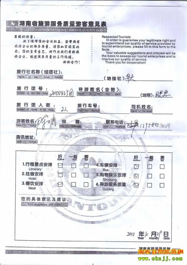 2010年4月29號(hào)陳先生旅游質(zhì)量反饋
