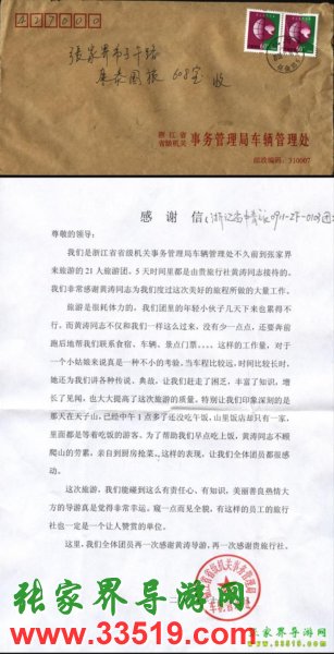 浙江省省級機(jī)關(guān)事務(wù)管理局車輛管理處致張家界康泰國旅導(dǎo)游黃濤感謝信