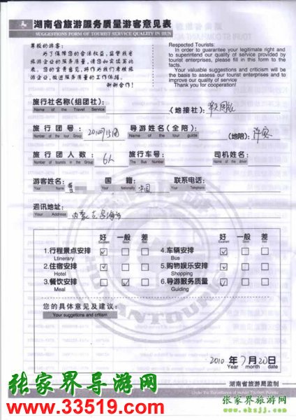 2010年7月20日內(nèi)蒙曹先生一行6位旅游質(zhì)量反饋