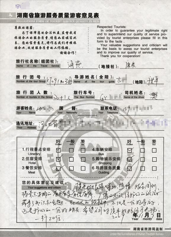 2009年11月3日河北田先生一行20人旅游接待質量反饋單:
